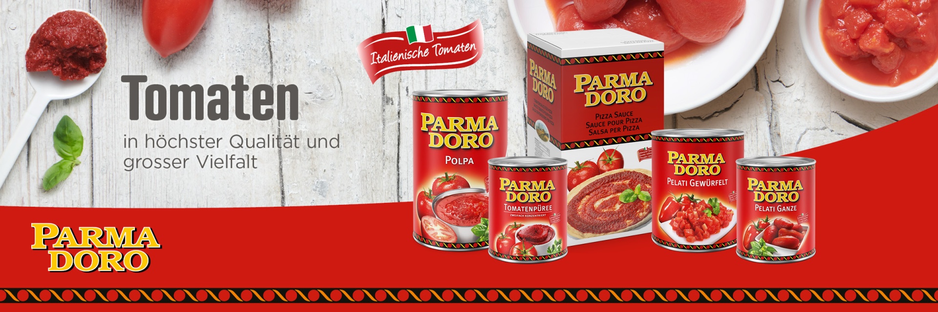 Die Parmadoro Pelati gewürfelt haben eine ideale Stückigkeit und eine schöne natürliche Farbe. Die Parmadoro Pelati (ganz) aus der Tipo-Roma-Tomate, haben eine feste Konsistenz. Sie können ganz verarbeitet werden, ohne sofort zu zerfallen. Erhältlich sind sie in verschiedenen Gebindegrössen.