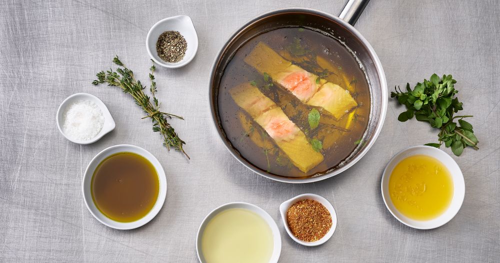 Wie so manche alte Kochtechnik erlebt auch das Confieren nun ein Revival. Nicht wegen der Notwendigkeit des Einmachens. Vielmehr wegen der Freude am Aussergewöhnlichen. Denn durch das Confieren werden Lebensmittel neu erlebbar, mit Aromen und Texturen, die aktueller denn je sind. Bei Fleisch wie auch etwa bei Fisch. Das schonende Garen im Öl sorgt dafür, dass Lachs besonders saftig bleibt und zart wird. Gleichzeitig ist Öl ein hervorragender Aromen-Transporteur. Knoblauch, Gewürze und frische Kräuter aller Art: Werden sie im Öl mitgegart, umhüllen deren Aromen das Gargut auch noch, wenn das Öl längst abgegossen und zur Wiederverwertung zur Seite gestellt wurde. Ohne, dass der Eigengeschmack von Fleisch, Fisch, Gemüse & Co. verloren ginge. Im Gegenteil, wie unser Rezept mit confiertem Lachs zeigt.