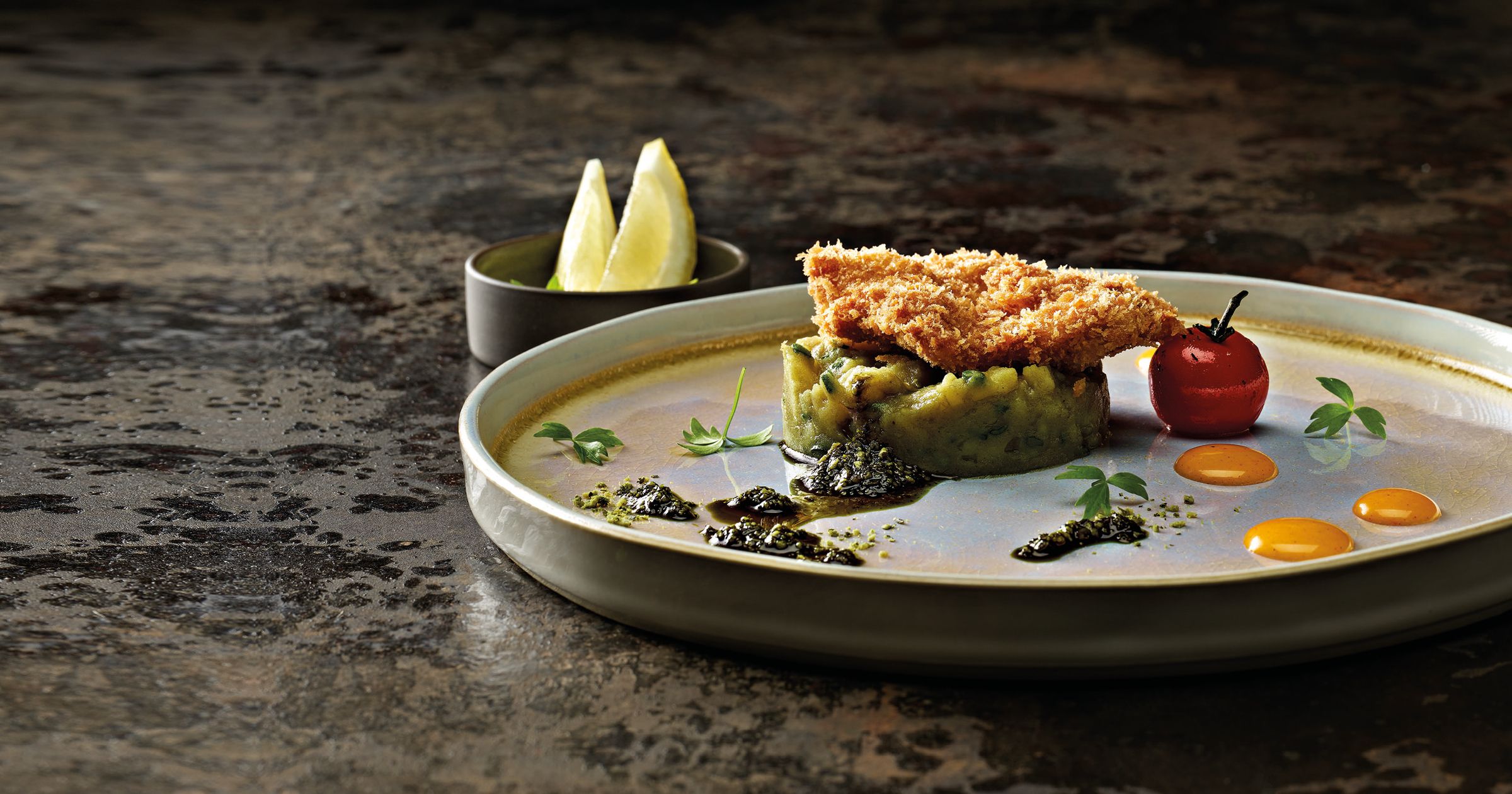 Die Kalbs Araignée-Schnitzel in heissem (ca. 170 Grad) Öl goldgelb backen und mit den restlichen Komponenten am Teller anrichten.