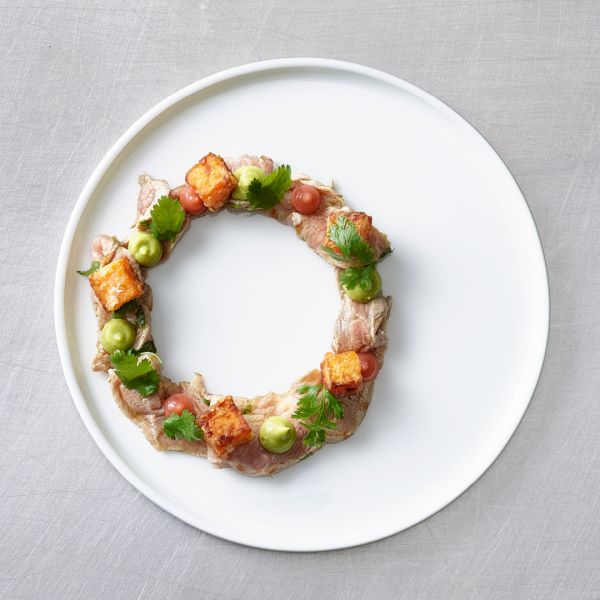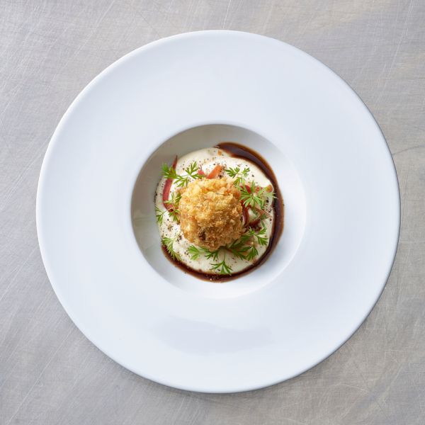 Das Araignée – oder auch Fledermaus genannt – ist mit Fett durchzogen und eignet sich perfekt zum Kurzbraten. Christoph Zrim serviert das Kalbs Araignée als «Wiener Art» mit cremigem Kartoffelsalat, Kürbiskernpesto und Chili Mayonnaise.