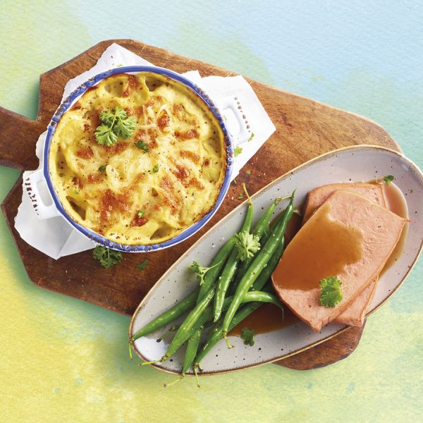 Ofenfrischer Fleischkäse an Rosmarinjus mit Kartoffelgratin und grünen Bohnen