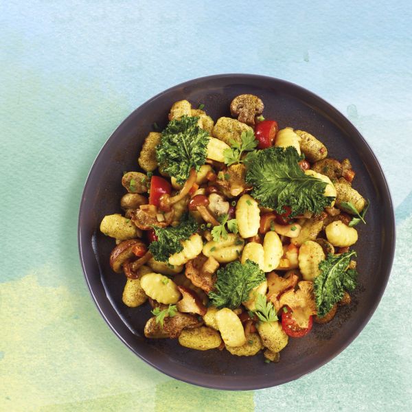 Gnocchi-Pfanne mit Pilzen, Wurzelgemüse und Federkohl