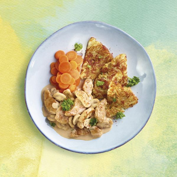 Zürcher Vegic-Geschnetzeltes mit Champignon-Crèmesauce, Rösti und glasierten Rüebli