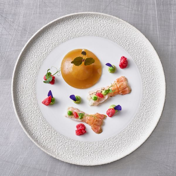 Duo von Langoustinen und Red Shrimps | Erbsen-Püree | Marinierte Himbeere