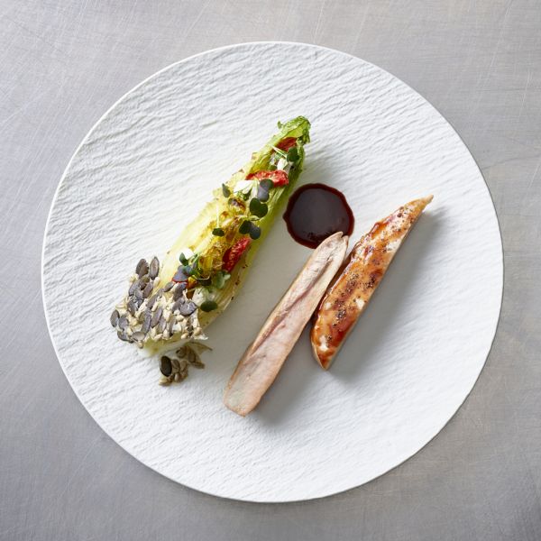 Perlhuhnbrust & Kaffee-Lack / Gegrillter Römersalat & Nuss-Chip