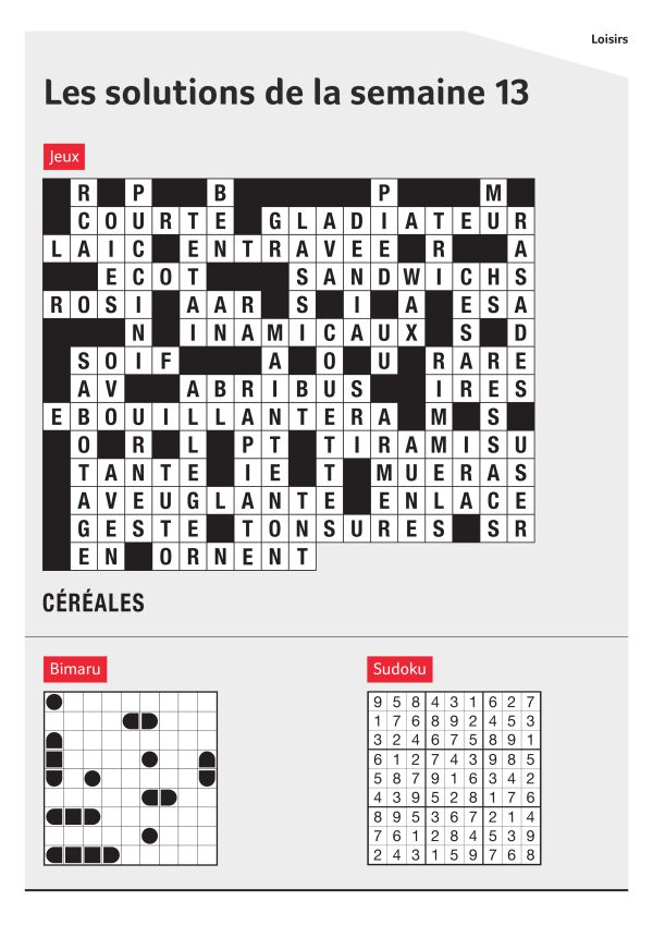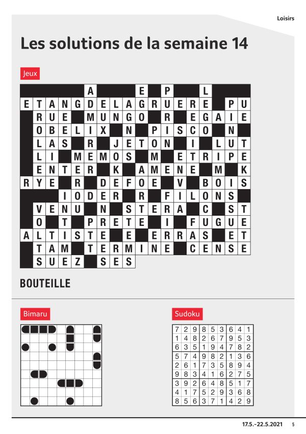 Express - Les solutions Vous trouverez ici régulièrement les solutions des jeux parus dans l’Express. Nous vous souhaitons «bonne chance»! Express - Les solutions de la semaine 14 30.03.2026 bis 04.04.2026 Express - Les solutions de la semaine 13 23.03.2026 bis 28.03.2026 Express - Les solutions de la semaine 12 16.03.2026 bis 21.03.2026 Toutes les promotions