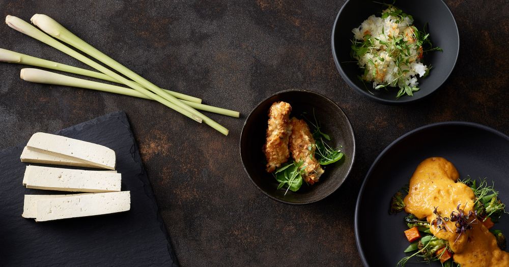 Découvrez la recette: Espuma de curry | Patate douce | Tofu aux noix de cajou | Brocoli | Riz Basmati aux agrumes | Haricots coco