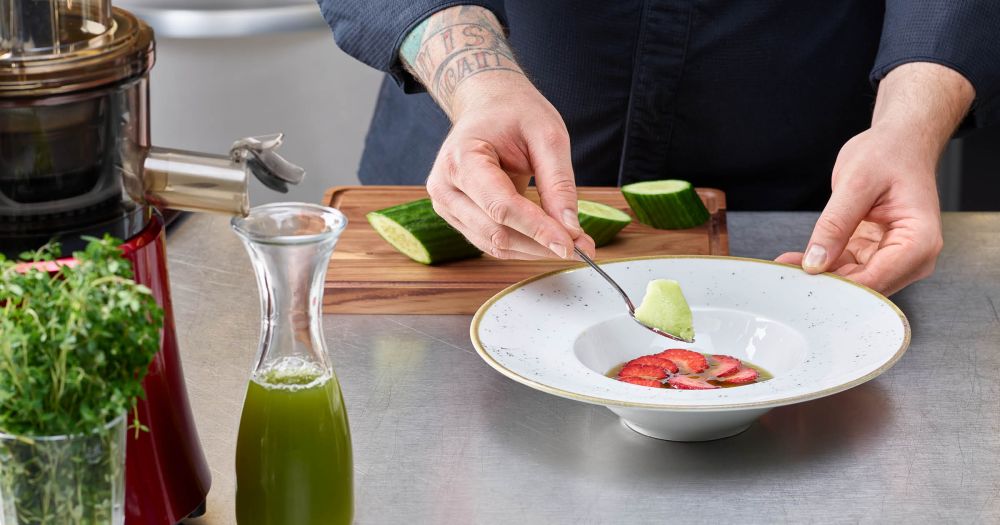 Pas de cuisine sans extracteur. Le mieux, c’est un Slow Juicer. Celui-ci presse le jus lentement et donc sans chaleur. Saveurs, couleurs, vitamines et enzymes sont ainsi précieusement conservées. Avec le jus de légumes-racines comme les carottes, le céleri, le céleri-branche ou les carottes du Palatinat, je complète par exemple les fonds que je prépare moi-même. On peut aussi s’amuser: plus la quantité de jus de carotte est importante, plus le fond sera sucré. Les restes de l’extraction peuvent, eux, être transformés en pâte de bouillon. Pour cela, il suffit de passer les épices classiques du bouillon comme le genièvre, le laurier, la livèche et le piment au pilon puis de les ajouter. Avec un extracteur de jus, il est également possible de créer des univers gustatifs inédits. Avez-vous déjà goûté un sorbet à l'oseille? Avec du jus de livèche? Deux éléments de mon idée de recette pour un dessert ou un pré-dessert salé et sucré.