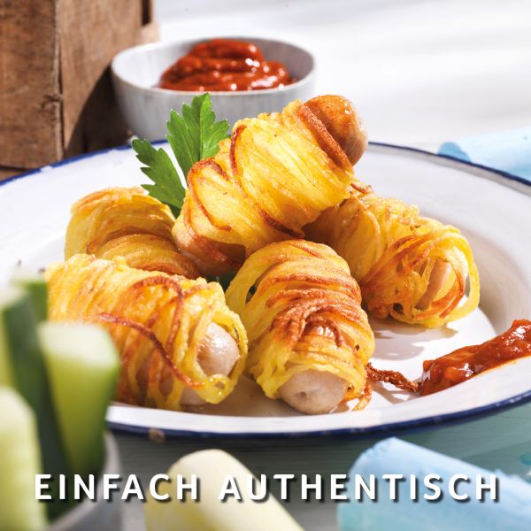 Chipolata en robe de pommes de terre croustillantes et ketchup au curry
