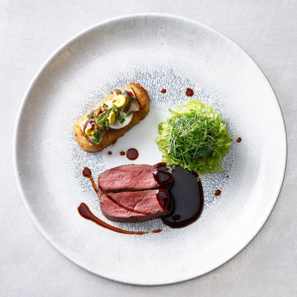 Selle de faon & pommes de terre crémeuses cuites au four | Farce aux fines herbes & chou frisé | Champignons des bois & gelée d'échalotes