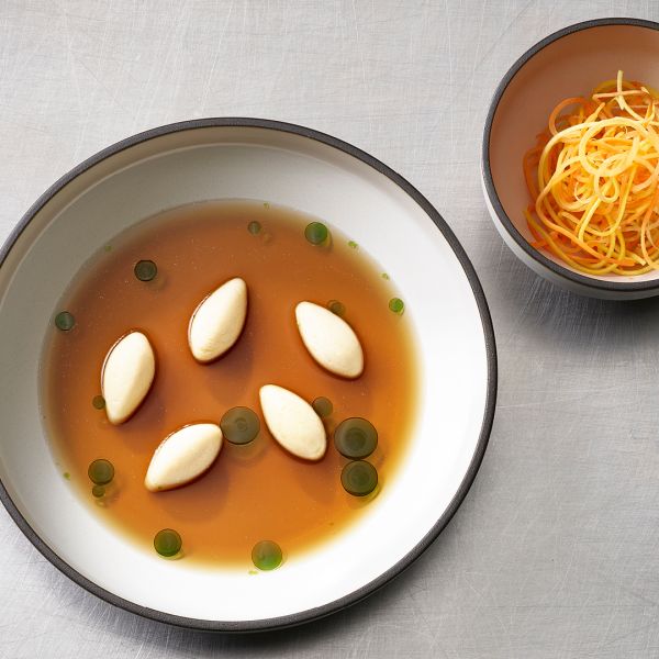 Consommé double de gibier | Légumes-racines | Huile d’épinard