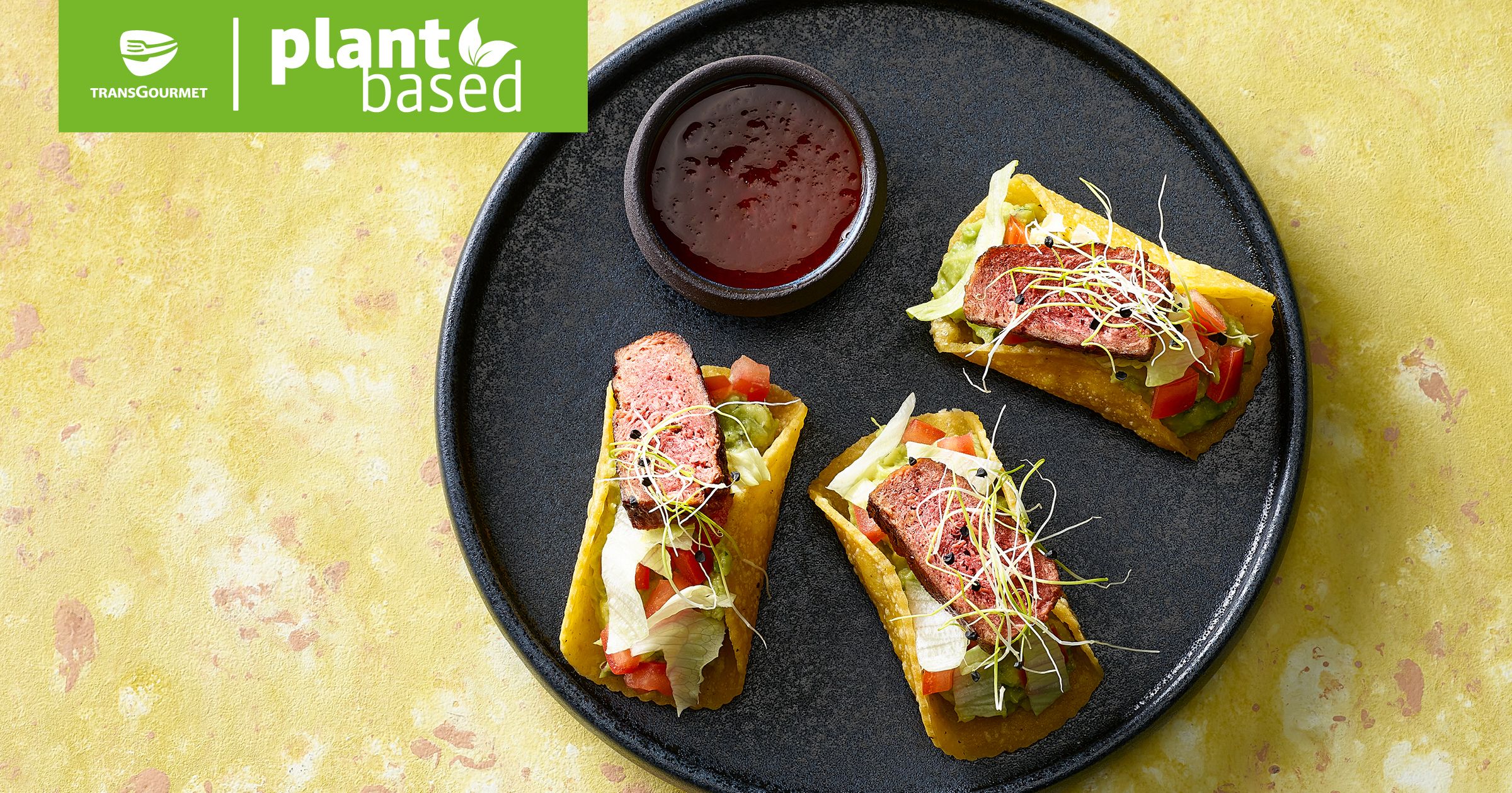 Remplir les Taco Shells aux 2/3 avec le guacamole. Garnir avec les dés de tomates épépinées, la salade iceberg et une tranche de steak Plant-based. Garnir de pousses de betterave et de rondelles d'oignon. Servir avec la sauce aigre-douce aux poires.