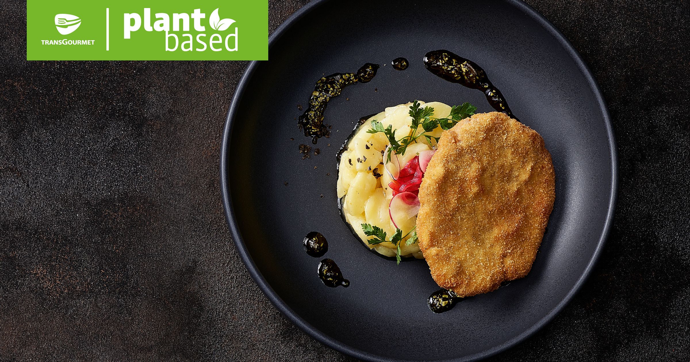Una scaloppina croccanti, servita con una tradizionale insalata di patate e raffinato pesto – tutto vegano.