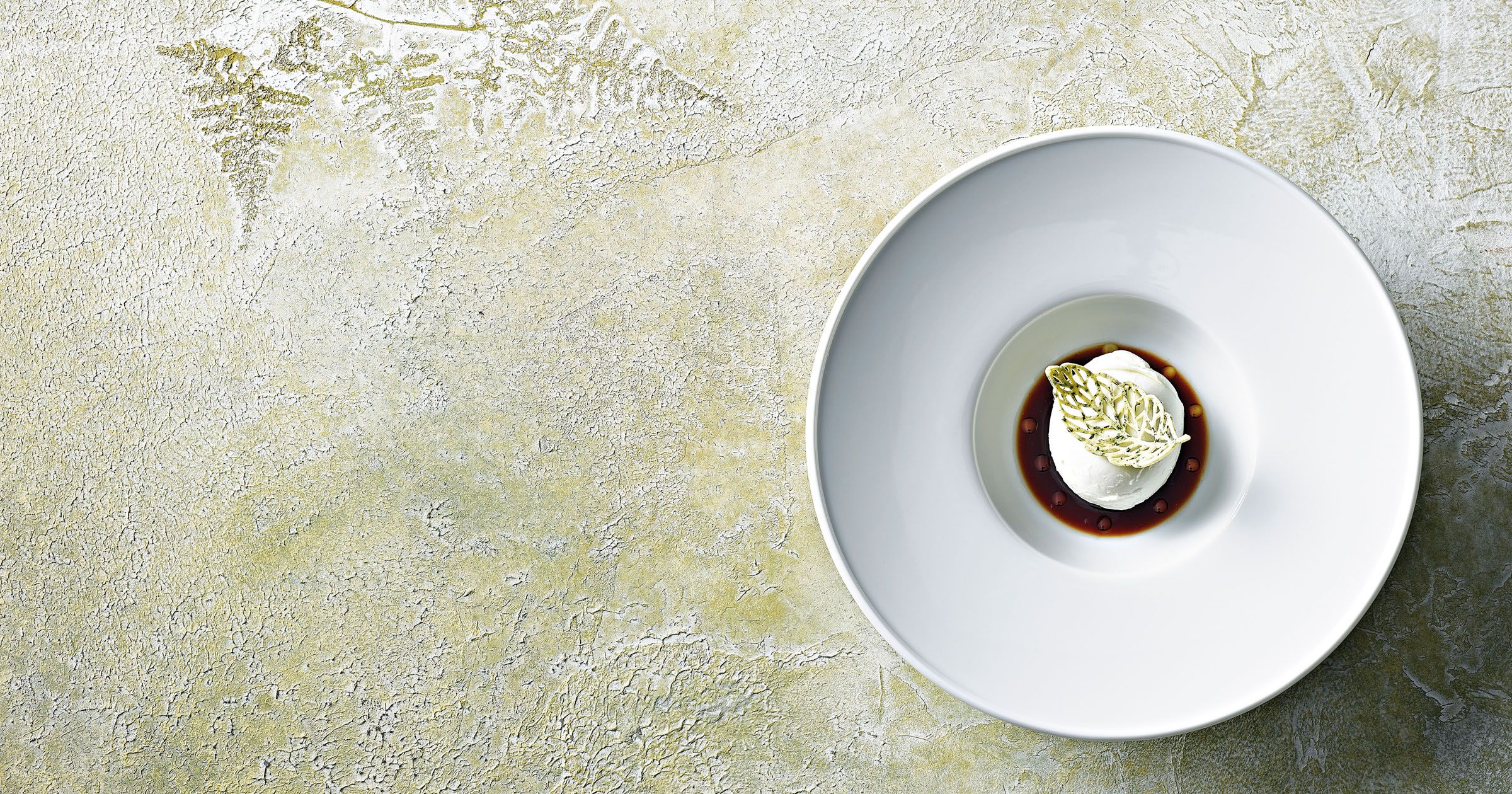 Posizionare la palla di mozzarella sopra la glassa al Balsamico. Versare delicatamente l'essenza di pomodoro bianca con un imbuto per praline. Fare qualche punto con l'olio di oliva e posizionare una chip sulla mozzarella.
