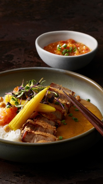 Cette relish Sweet & Spicy a été spécialement conçue pour apporter une touche de saveur au katsu curry. La combinaison de tomates, de miel, de piment et de lime apporte de la fraîcheur, un piquant subtil et une douceur équilibrée au plat et complète idéalement la sauce au curry épicée ainsi que la poitrine de porc croustillante. Un petit plus qui fait sensation.