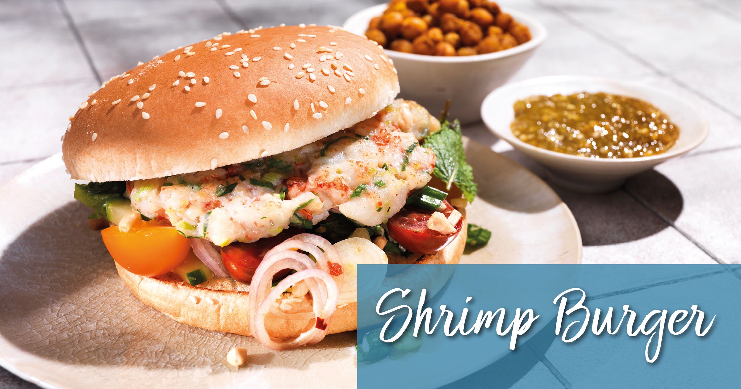 Shrimp Burger / Thai Salad / Green Chili Relish / Ceci tostati indiani
